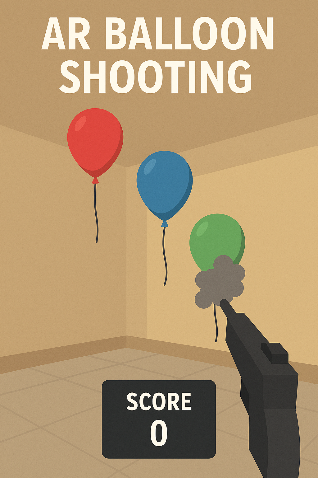Includes balloon spawning, raycast-based shooting, particle pop effects, and a scoring system